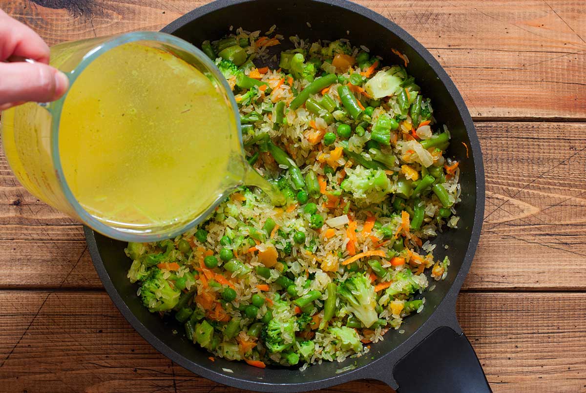 - Añadimos dos tazas de caldo de verduras que habremos preparado con anterioridad. Si no tenemos podemos también comprarlo ya hecho.