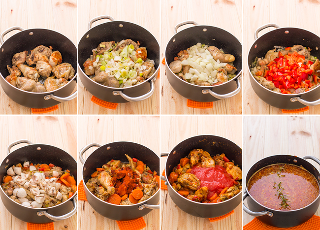 - Dejamos que evapore el alcohol un par de minutos y seguidamente añadimos el caldo de pollo y una rama de romero limpia. Dejamos cocinar hasta que rompa a hervir.