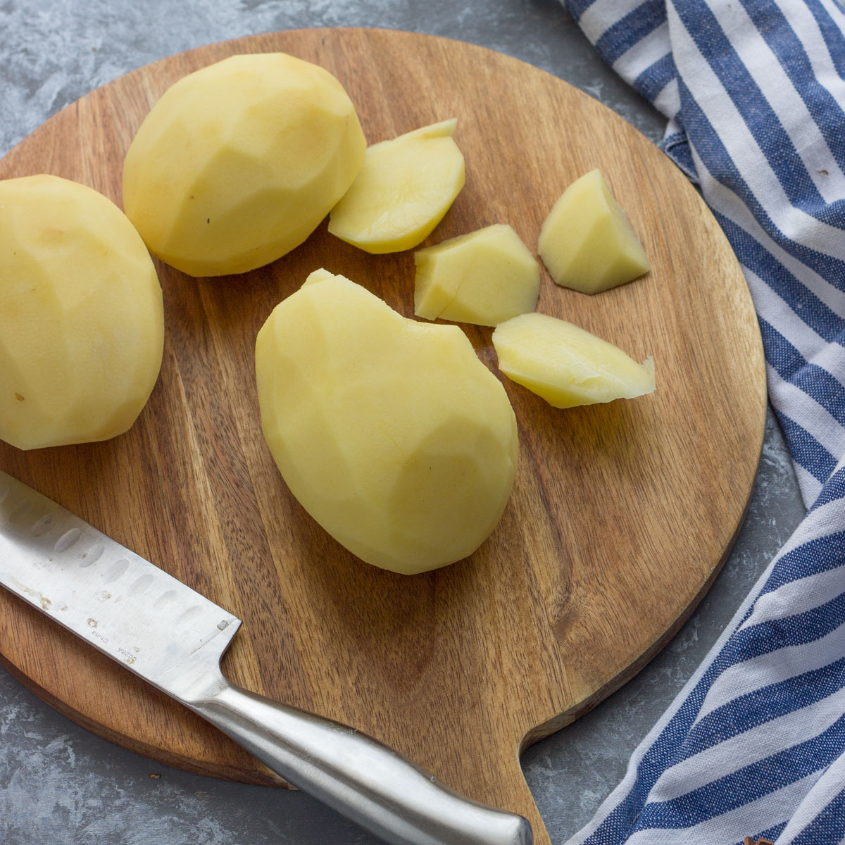 - Pelamos la patata y la cortamos en dados pequeños chascándola con las manos para que suelten el almidón, de tamaño similar para que se cocinen por igual.
