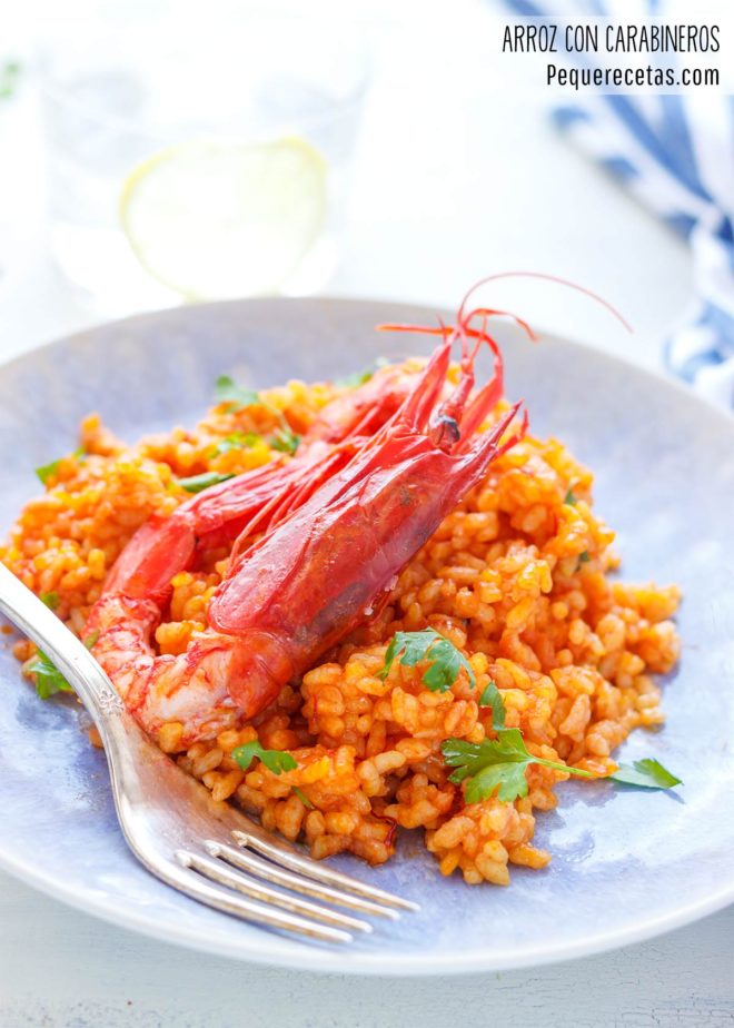 El carabinero es un crustáceo de aspecto similar a la gamba y los langostinos, pero más grande y de color rojo intenso. Puede alcanzar los 30 cm, pero para los arroces es mejor utilizarlos de tamaño mediano, dejando los más grandes para cocinarlos a la plancha, ya que en este caso lo que le aporta el carabinero sobre todo es el sabor con las cáscaras y las cabezas con sus corales al fumet.