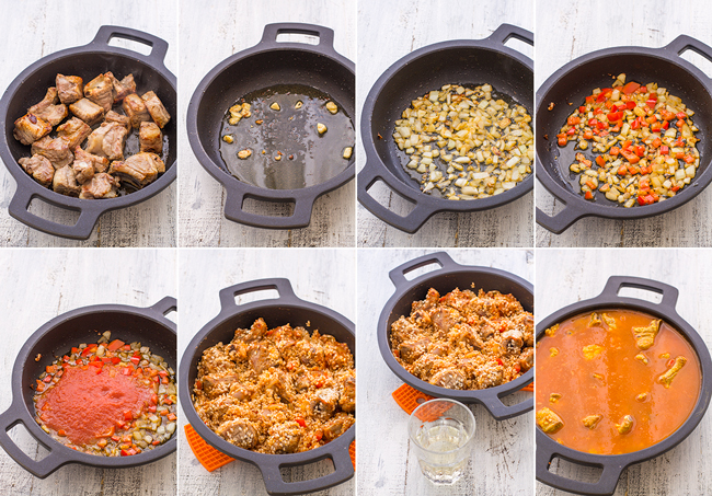 Vertemos el tomate triturado y cocinamos hasta que reduzca unos 10 minutos. Añadimos entonces las costillas de cerdo y el arroz, mezclamos todo bien y dejamos cocinar un par de minutos.