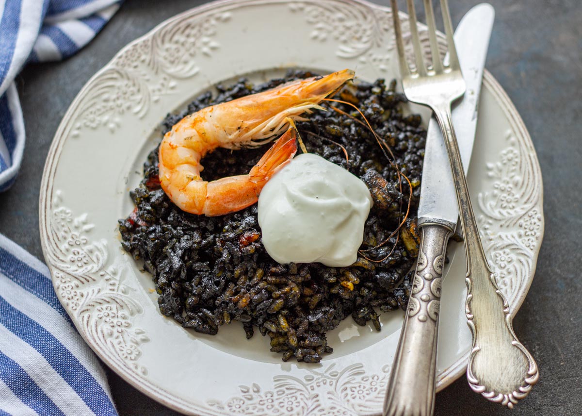 - Servimos el arroz negro con el alioli y un langostino a cada comensal.