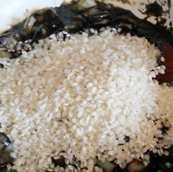 - Añadimos el arroz, removemos durante un par de minutos y ya sólo nos queda poner el caldo de pescado.