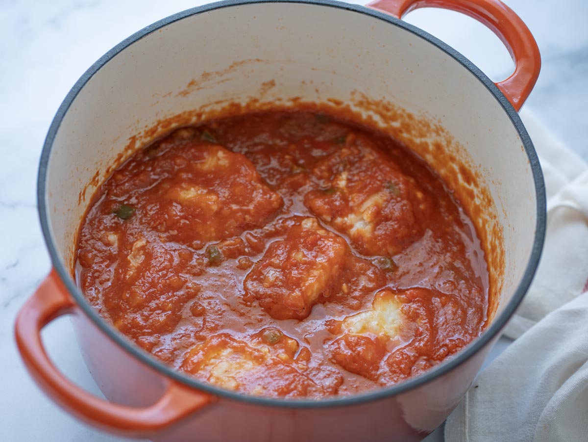 - Añadimos los lomos de bacalao frito a la salsa de tomate