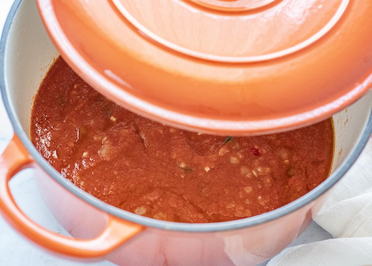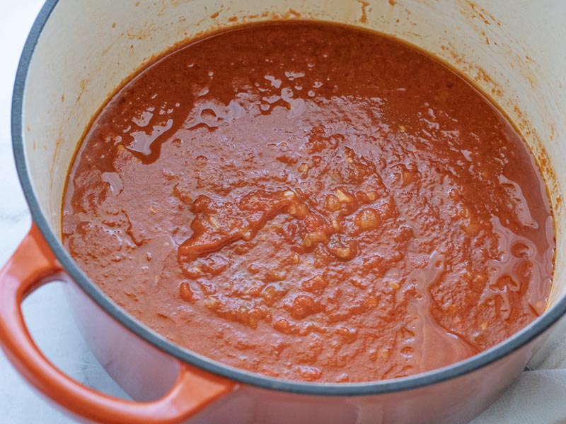 Aunque hay muchas variaciones de esta receta al cocinar la salsa de tomate nosotros, después de probar muchas, nos quedamos con ésta, que incorpora un sofrito de cebolla y ajo con pimientos, y el ligero toque picante de la cayena. Puedes poner o quitar ingredientes a tu gusto, pero esta receta en nuestra casa triunfa siempre, y quedan los platos limpios.