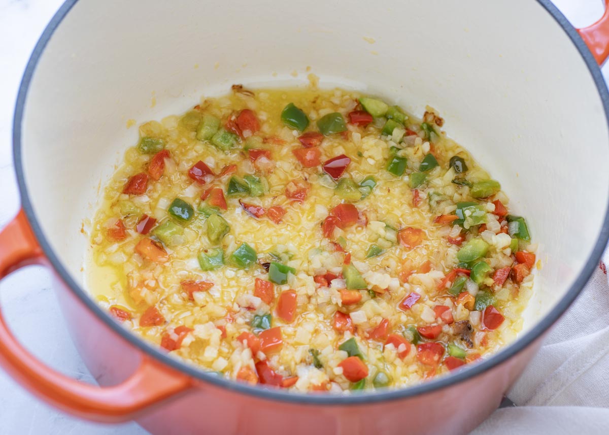 - Cuando la cebolla esté dorada añadimos los pimientos picados en cubitos pequeños