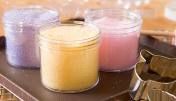 - Pon un poco de miel o sirope alrededor de la parte superior de cada jarra y riégalo con el azúcar de colores.