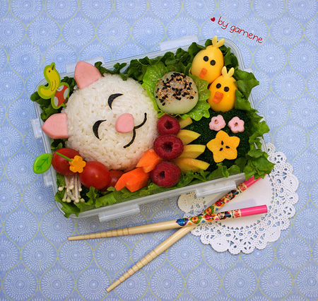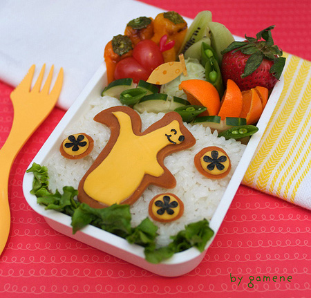 - Bento temático: Personajes de dibujos animados hechos con queso, alga nori y verduras.
