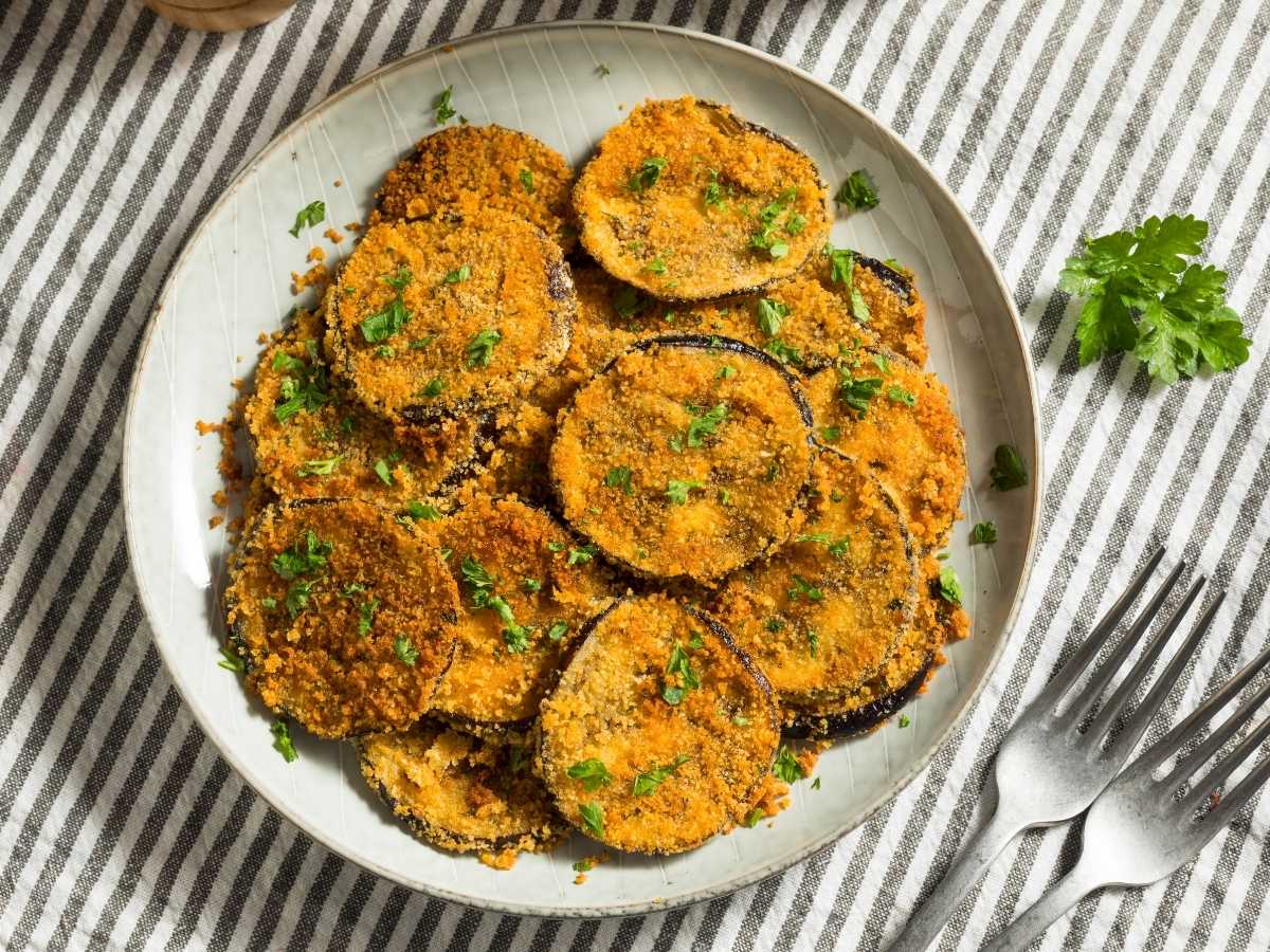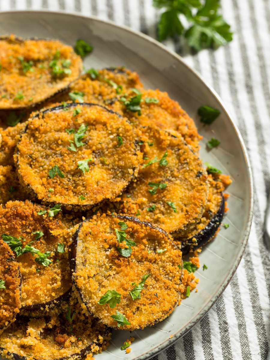 - Sirve las berenjenas rebozadas calientes, decoradas con perejil fresco picado si lo deseas.