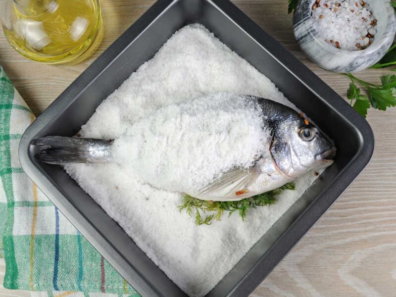 - Disponemos encima el besugo, limpio (pero con escamas), y lo cubrimos con más sal, presionando con las manos para que se compacte.