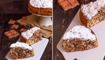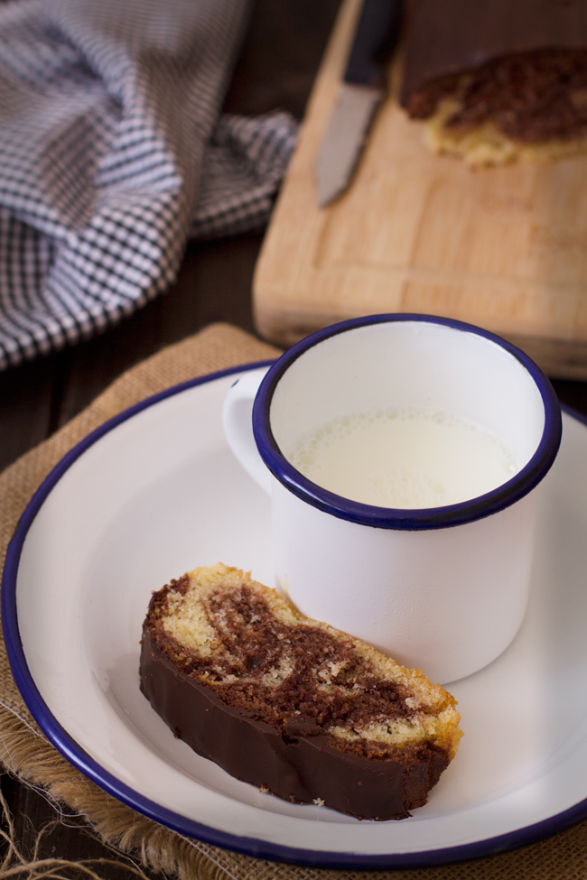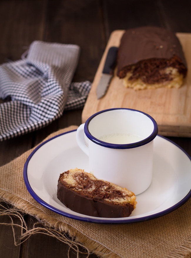 Se trata de un bizcocho bicolor o bizcocho marmolado. Una vez horneado el bizcocho, preparamos la cobertura de chocolate. No os dejéis este paso porque hace que el bizcocho sea mucho más especial. Pensad en la textura: esponjosa, suave, aromática y con el crujiente de la cobertura… ¡irresistible!