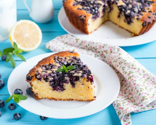 Este bizcocho de arándanos con yogur griego es un placer para los sentidos.