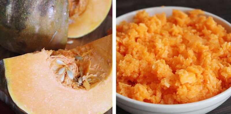 - Le quitamos la piel a la calabaza, las pepitas y los filamentos interiores, hasta obtener 300 g de pulpa limpia