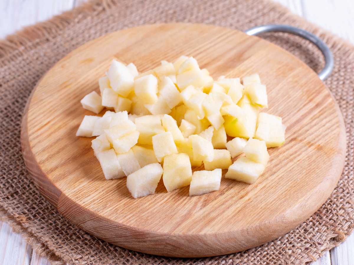 - Lava, pela y corta la manzana en trocitos pequeños. Si prefieres que tenga sabor y jugosidad de la manzana pero que no se note puedes también pelarla y rallarla. Para evitar que se oxide mientras preparas la masa, puedes añadirle unas gotas de zumo de limón.