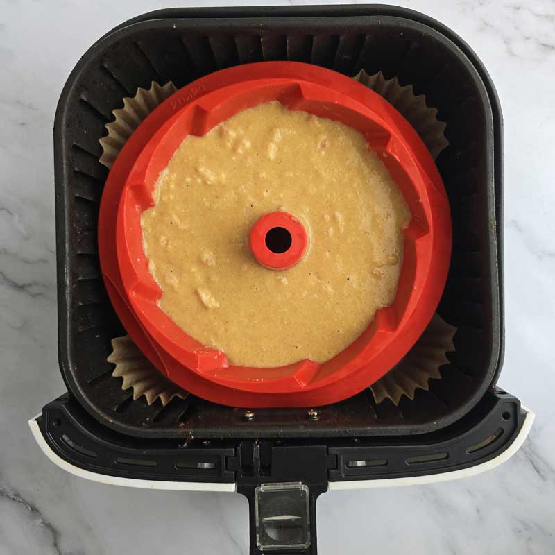 - Engrasa un molde tipo bundt cake (o un molde apto para la freidora de aire) y vierte la masa dentro. Asegúrate de no llenarlo más de ¾ de su capacidad para que el bizcocho tenga espacio para subir.