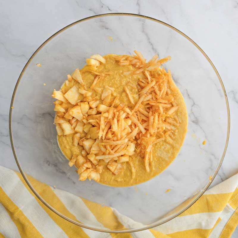 - Incorpora los trocitos de manzana y mezcla suavemente hasta que se repartan de manera uniforme en la masa.