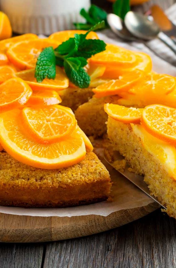 Ingredientes: 320 g de harina de maíz; 1 sobre (16 g) de levadura química sin gluten (tipo Royal); 2 huevos; 200 ml de leche; 75 g de mantequilla; 75 g de aceite de oliva suave; 220 g de azúcar; 1 pizca de sal; la cáscara rallada de un limón o una naranja.