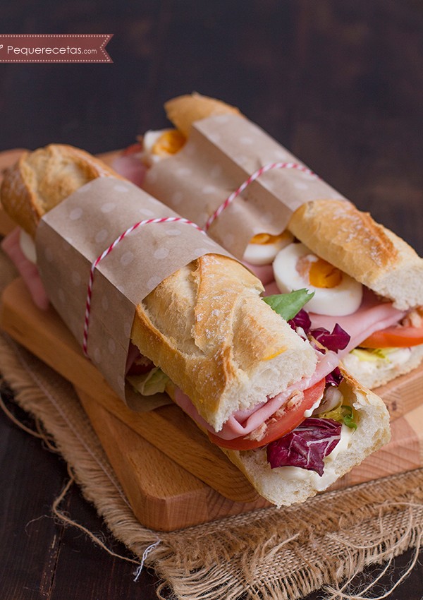 Ingredientes: Pan baguette; atún enlatado al natural; lechuga; rodajas de tomate; rodajas de cebolla; rodajas de huevo cocido; aceitunas verdes; mayonesa ligera; sal; pimienta.