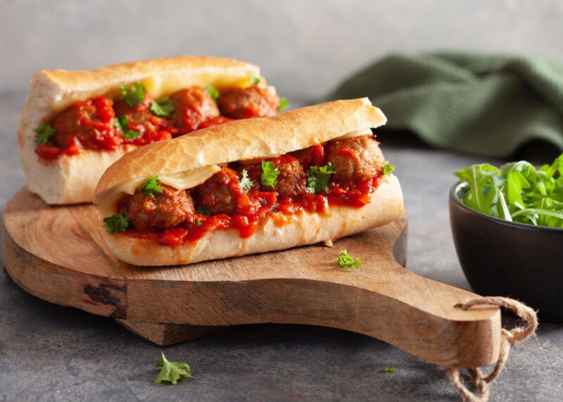 Ingredientes: Pan baguette; albóndigas; salsa de tomate; queso mozzarella o provolone; perejil fresco picado.