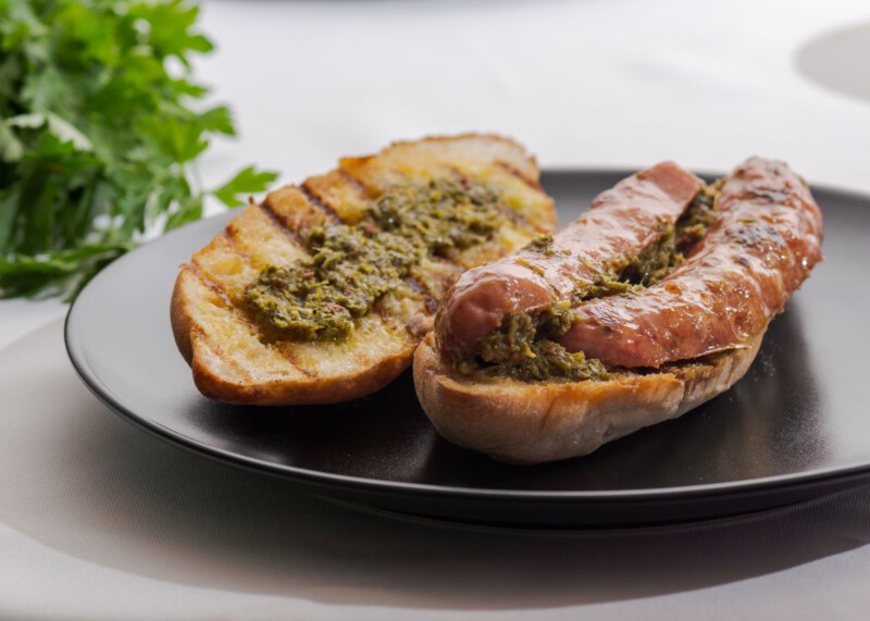 Ingredientes: Pan francés o baguette; chorizo criollo; chimichurri (mezcla de ajo, perejil, orégano, vinagre, aceite de oliva, sal, y pimienta).