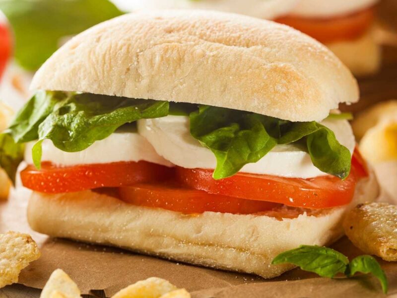 Ingredientes: Pan ciabatta; mozzarella fresca en rodajas; tomate maduro en rodajas; hojas frescas de albahaca; aceite de oliva virgen extra; sal; pimienta negra recién molida.