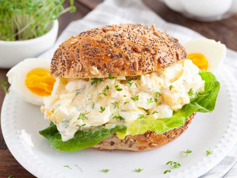 Ingredientes: Pan integral con semillas; huevos cocidos; mayonesa; mostaza; cebollino picado; lechuga romana; sal; pimienta.