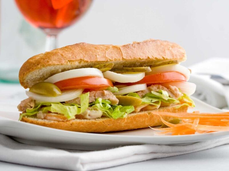 Este es un bocadillo de atún, una opción ligera y llena de proteínas, perfecta para un almuerzo rápido o una cena ligera. La combinación de atún, verduras frescas y huevo cocido en un pan crujiente hace de este bocadillo una comida equilibradda y deliciosa.