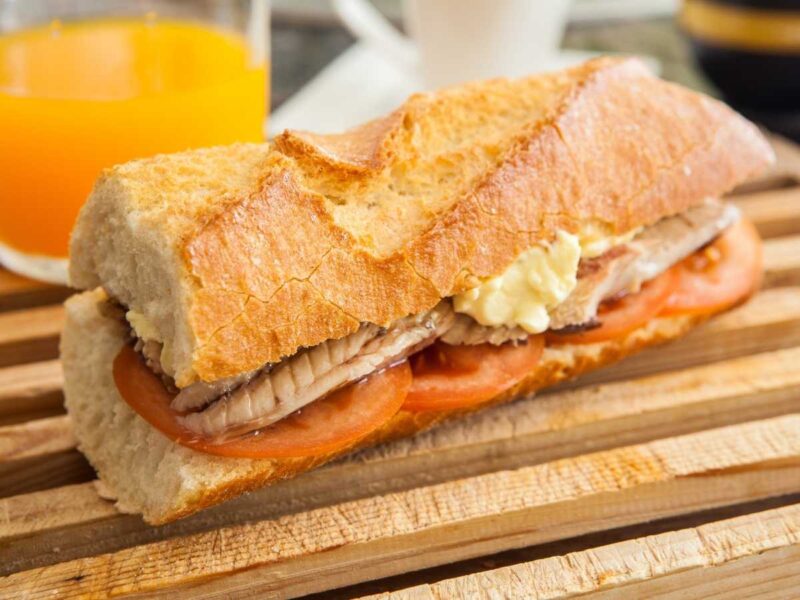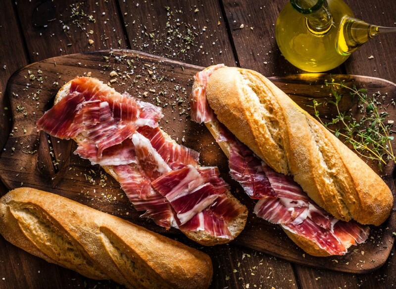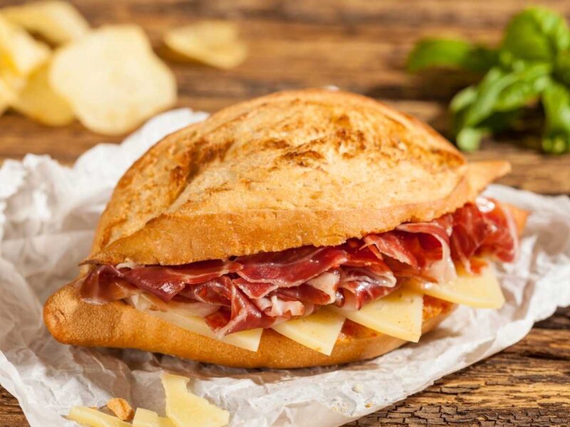 Otra deliciosa opción es un bocadillo de jamón serrano y queso, una variante del clásico bocadillo de jamón serrano. Aquí, las lonchas de jamón serrano se acompañan de queso curado, lo que añade una capa extra de sabor y textura. Es una combinación que no falla, perfecta para cualquier ocasión.