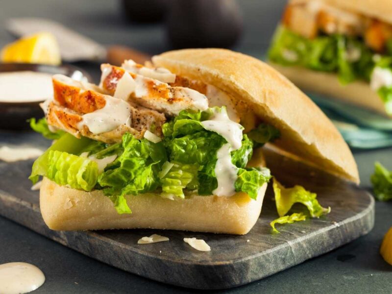Ingredientes: Pan ciabatta; pechuga de pollo a la parrilla; lechuga romana; aderezo César; queso parmesano rallado; sal; pimienta.