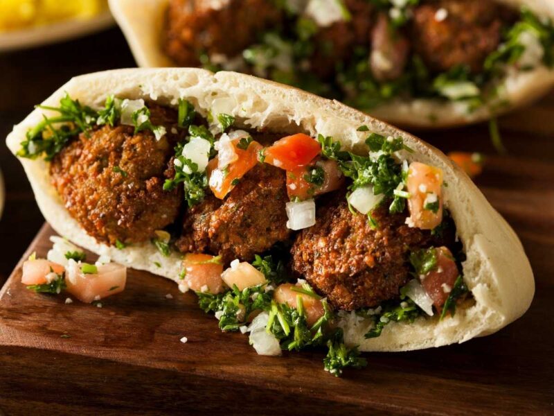 Ingredientes: Pan pita; falafel (hecho de garbanzos, ajo, cebolla, comino, cilantro, perejil); tomate picado; cebolla picada; perejil fresco picado; tahini o salsa de yogur; sal.