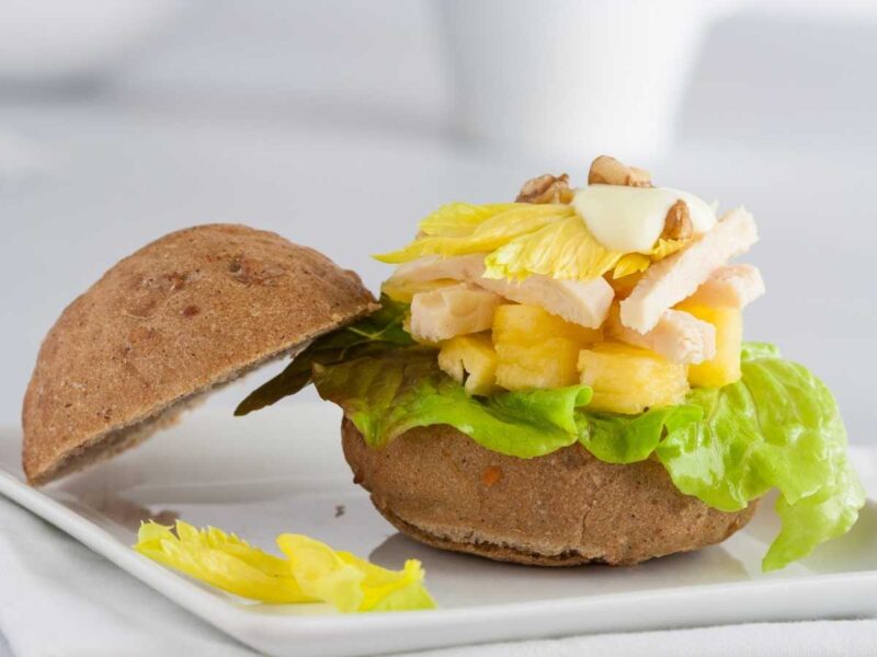 Ingredientes: Pan integral; pechuga de pollo cocida en tiras; mango fresco en cubos; lechuga; nueces picadas; mayonesa; sal; pimienta.