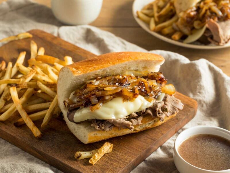 Ingredientes: Pan baguette; rosbif en rodajas finas; queso provolone; cebolla caramelizada; mantequilla; caldo de carne para mojar (opcional).