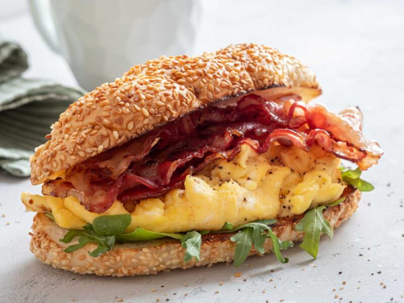 Ingredientes: Pan con semillas de sésamo; huevos; bacon; rúcula; mantequilla; sal; pimienta.