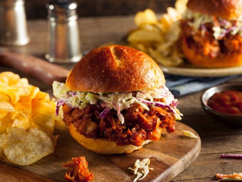 Ingredientes: Pan de hamburguesa; jackfruit (yaca) enlatado o fresco; salsa barbacoa; ensalada de col (coleslaw) hecha con repollo y zanahoria rallada y aliñada con mayonesa vegana; aceite; sal; pimienta.
