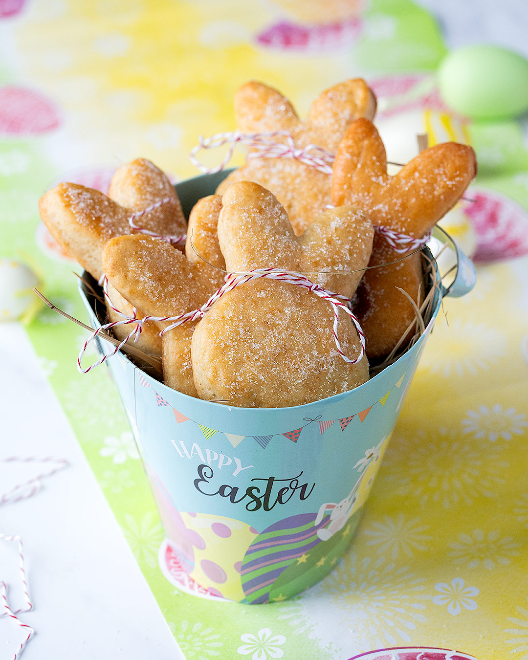 Después de hornearlos, los conejitos aún calientes se untan con mantequilla y se rebozan en azúcar. ¿Quién puede resistirse a eso? Además, la masa es más rápida y fácil de preparar que una masa de levadura, lo que deja tiempo para hornear otras delicias, como la tradicional Mona de Pascua, este bizcocho de Pascua o estas galletas de Pascua decoradas.