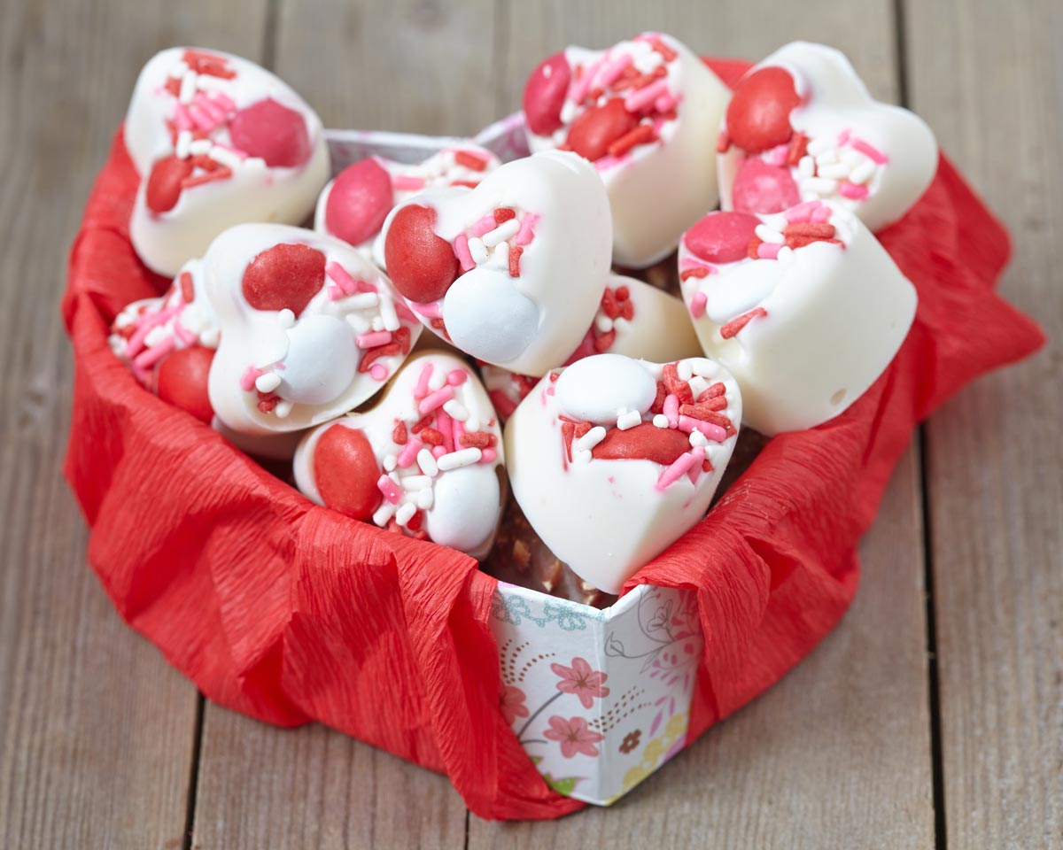 Si quieres algo menos clásico y más original, puedes por ejemplo poner lacasitos y sprinkles de San Valentín dentro de los moldes antes de echar el chocolate, así se verán como estos de la foto. Te sugerimos algunos: