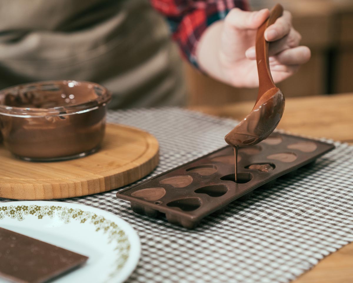 - Ya tenemos el chocolate atemperado, solo nos queda ponerlo en los moldes con una cuchara.