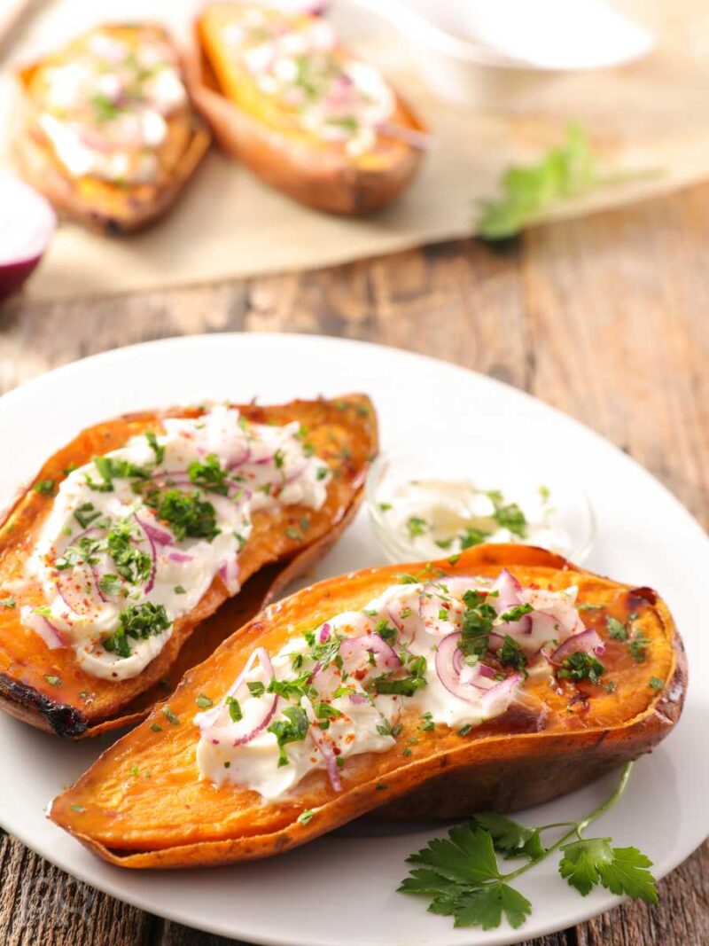 - Cuando los boniatos estén listos, sácalos del horno y deja que se enfríen un poco. Esto evita que la crema agria se derrita demasiado rápido y te permite disfrutar mejor las diferentes texturas. Luego, añade una cucharada generosa de crema agria o yogur griego sobre cada boniato.