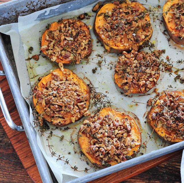 En este caso se trata de una receta en la que cocinamos el boniato al horno y lo acompañamos con un crujiente de nueces con queso parmesano: