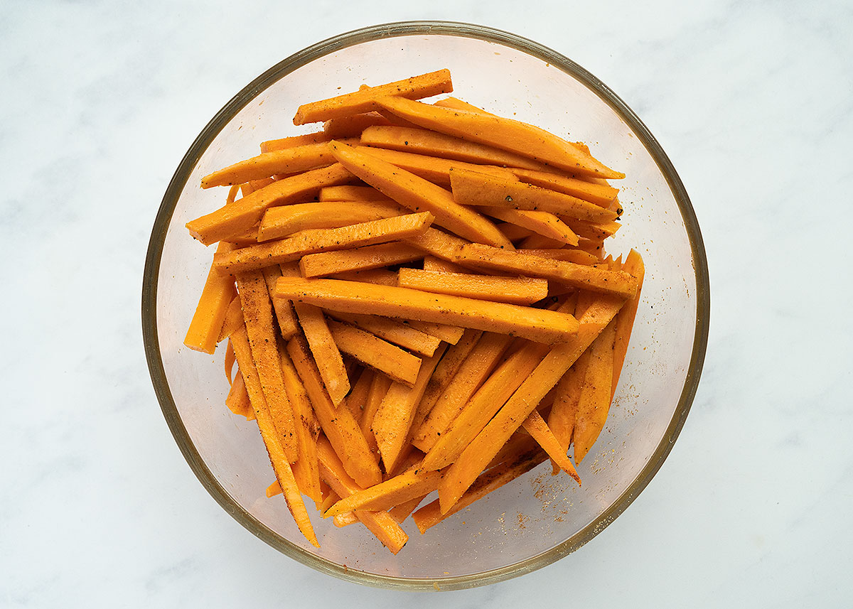 - Precalentamos la freidora de aire a 190°C durante 5 minutos. En este tiempo colocamos los bastoncitos de boniato en un bol grande y añadimos el aceite de oliva, la sal, la pimienta, el ajo en polvo y el pimentón y lo mezclamos todo bien, asegurándonos de que todos los bastoncitos queden bien impregnados.