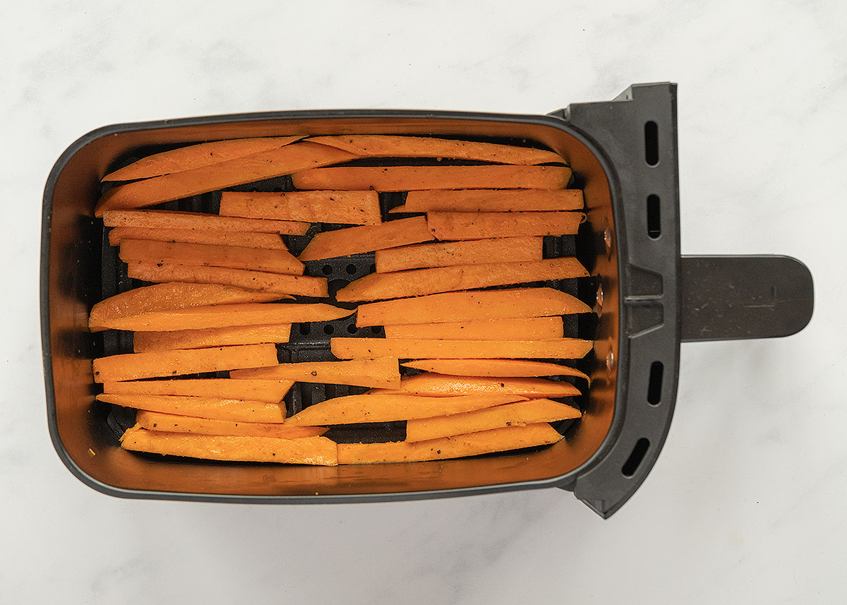 - No llenes la cesta demasiado. Las patatas de boniato no deben apilarse e idealmente dejaremos también algo de espacio entre ellos. Dependiendo de la capacidad de nuestra freidora de aire tendremos que hacer varias tandas. Si no queremos que las primeras tandas queden frías, podemos sacar los bastoncitos pasados 10 minutos, hacer las tandas necesarias y una vez hecha la última metemos todas juntas durante 1 o 2 minutos para calentarlas.
