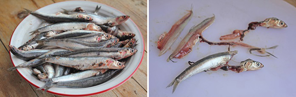 - Si quieres también puedes mantener la cabeza, para ello sigue el mismo proceso pero realiza un pequeño corte en la espina junto a la cabez y pasa el dedo para retirar la espina y las tripas del boquerón, luego corta la espina en la parte de la cola.
