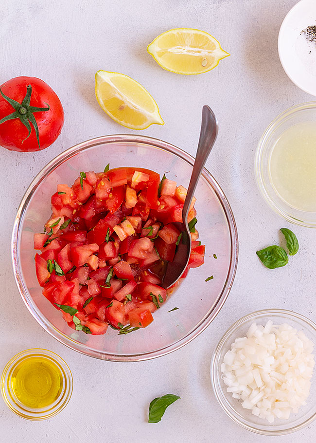 Troceamos los 4 tomates y los disponemos en un cuenco, añadimos 2 cucharadas de albahaca fresca picada, 1 cucharada de cebolleta fresca picada, 1 cucharada de aceite de oliva virgen extra, 1 cucharadita de zumo de limón, 3/8 de cucharadita de sal, 1/4 de cucharadita de pimienta, y mezclamos.