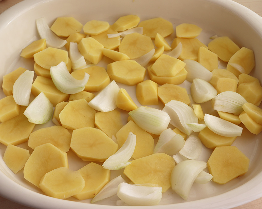 - Pelamos las patatas y las cortamos en rodajas y las cebollas en cascos.