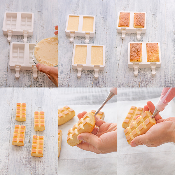 - Vertemos la masa de bizcocho en moldes para helado de silicona como los que os mostramos arriba