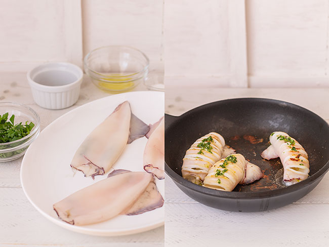 - Es entonces cuando les hacemos unos cortes en la misma sartén o retirando los calamares a un plato (hay que hacer unos cortes como veis en la fotografía sin llegar a cortar del todo el calamar)