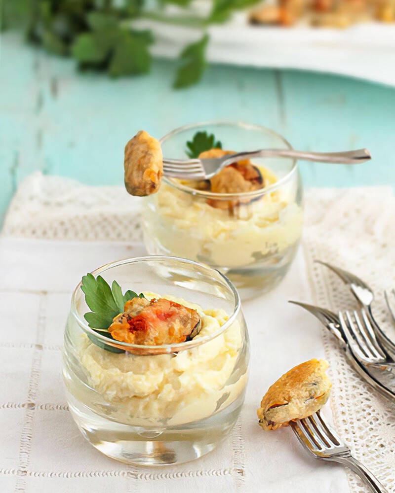 La brandada de bacalao es ya una delicia con un poco de pan, pero si la probáis con esta tempura de mejillones os vais a enamorar:
