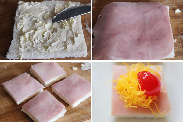 Preparación: Si habéis comprado el pan de molde con corteza, se la quitamos. Untamos una rebanada de pan de molde con un poco de mantequilla, ponemos encima una loncha de jamón York, lo cortamos en cuatro y cuadramos el jamón de york, es decir, recortamos si sobra algún borde. Adornamos con un poco de huevo hilado y media guinda.