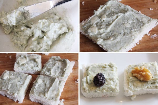 Ingredientes: Pan de molde; queso azul; pasas; nueces.