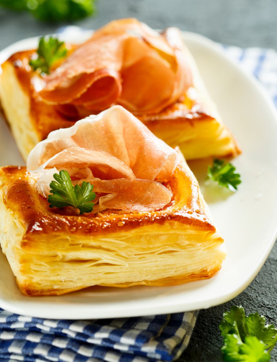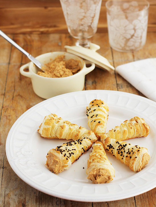 Ingredientes: láminas de hojaldre, pasta brisa, pasta quebrada; relleno elegido: salmón ahumado, queso crema y rúcula, foie y cebolla caramelizada, sobrasada con miel; Palitos de helado, brochetas, o palitos de piruleta.